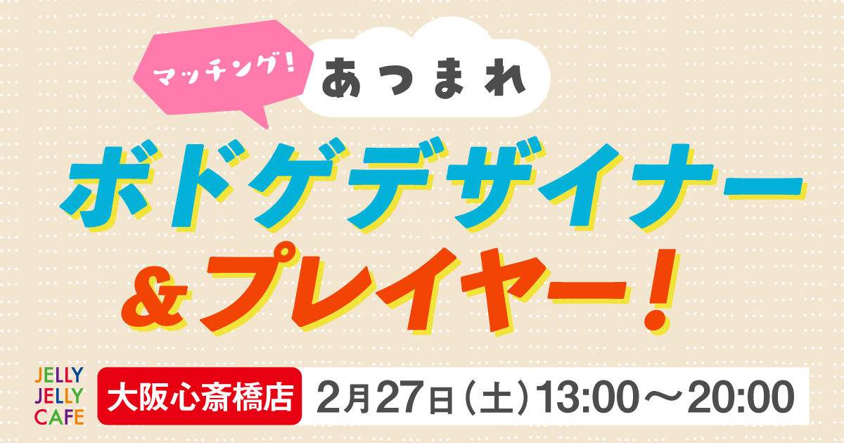 終了 2021年2月27日(土) 【大阪心斎橋店】マッチング!あつまれボドゲデザイナー&プレイヤー! by JELLYJELLYCAFE大阪心斎店 大阪市中央区東心斎橋1-12-19エイトビルヂング5F